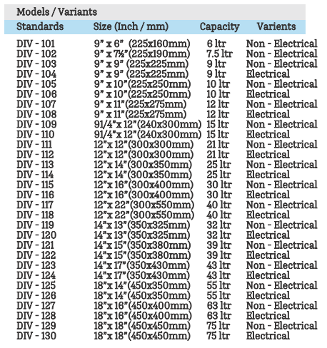 Size/Capacity: 6ltr – 75ltr