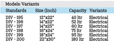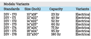 Size/Capacity: 40ltr –180ltr